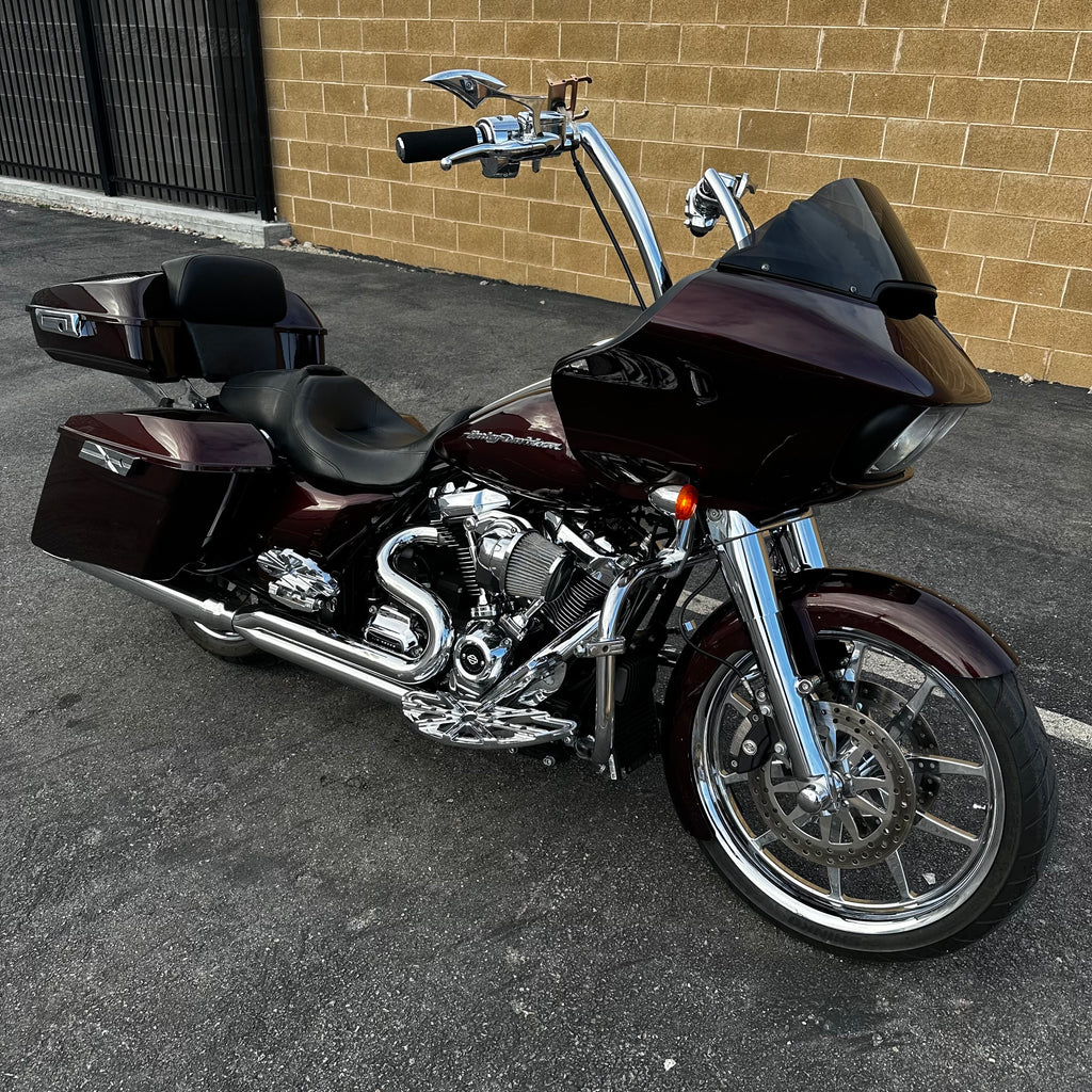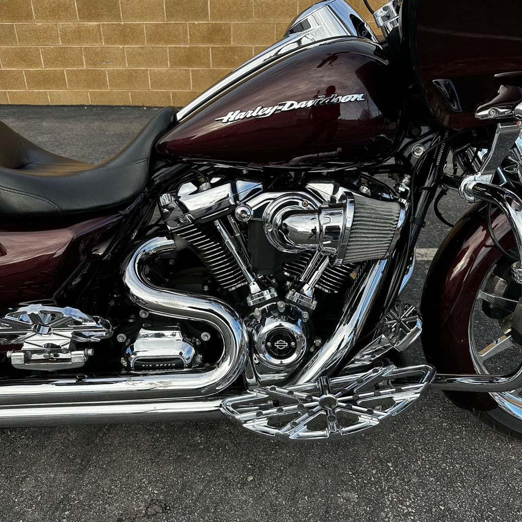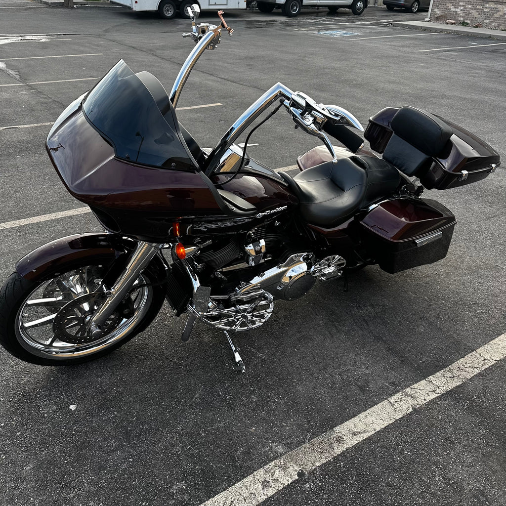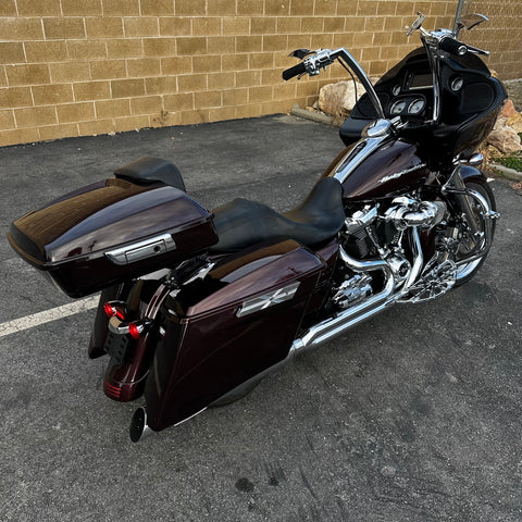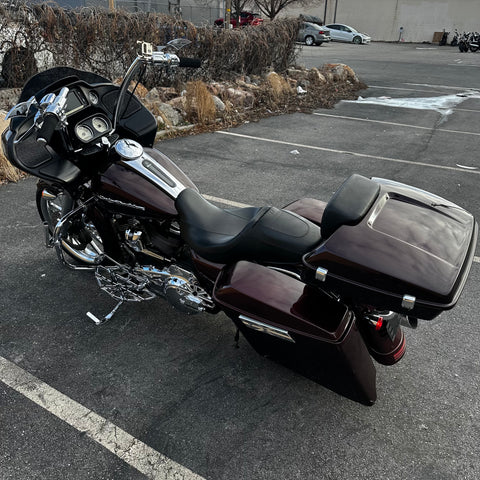 Super cool look on this Road Glide! It has the 107ci engine with a stage 1 performance package with the upgraded exhaust and air intake, Upgraded handlebars, upgraded front wheel, color matched "pizza box" tour pack, and some smaller upgrades like the floorboards and grips. It has ONLY 8,300 miles and a clean title!